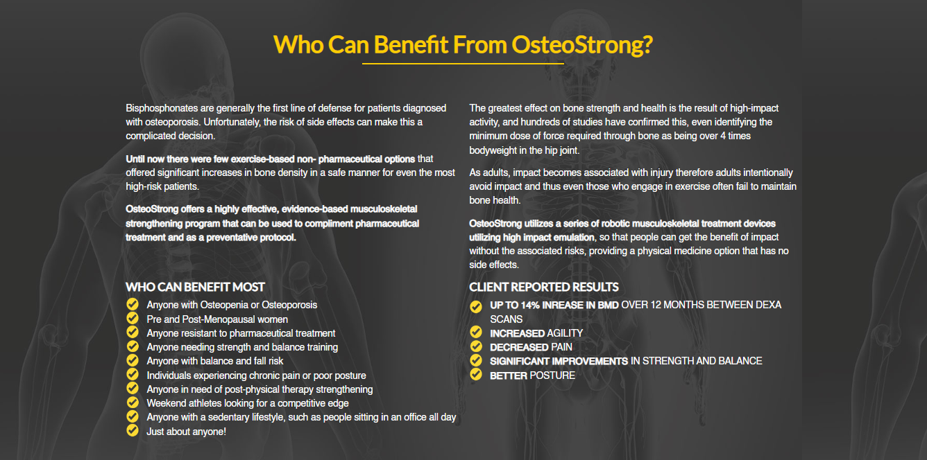 OsteoStrong sessions utilize a series of devices that allow axial compression of bone to emulate the effect of impact, which is called Osteogenic Loading.Because of the optimized positioning of the human body, loading forces go through the human bone that are far higher than those seen in daily activity or weight training. Heavy loading is already understood and recommended by all international bodies of medical education, but at OsteoStrong, we make it safer.